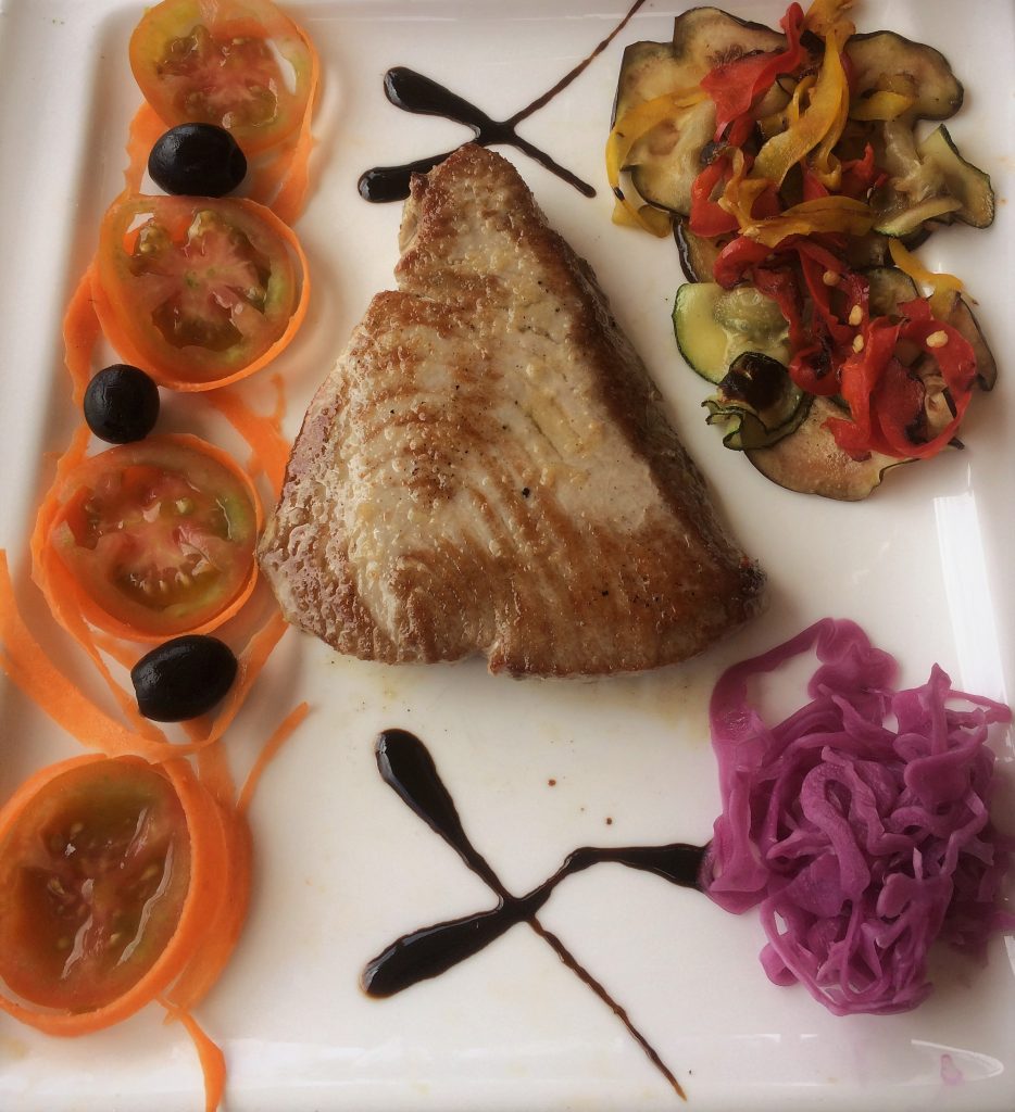 Ennen reissua luimme jostakin, että ruoka on hyvää. Minusta se oli keskinkertaista, todella mietoa ja vähän maustettua. Emme kuitenkaan käyneet joka päivä syömässä ”ulkona”, vaikka kaikki ruuat taidettiinkin ulkoilmassa nauttia. Olisin halunnut maistella enemmän mereneläviä, mutta jotenkin se ei nyt oikein onnistunut. Kerran pyysin grillattua wahoota. Sitä oli listalla, mutta ei ravintolassa. Sain grillattua tonnikalaa, joka ei oikein maistunut miltään. Annos oli kyllä kaunis.