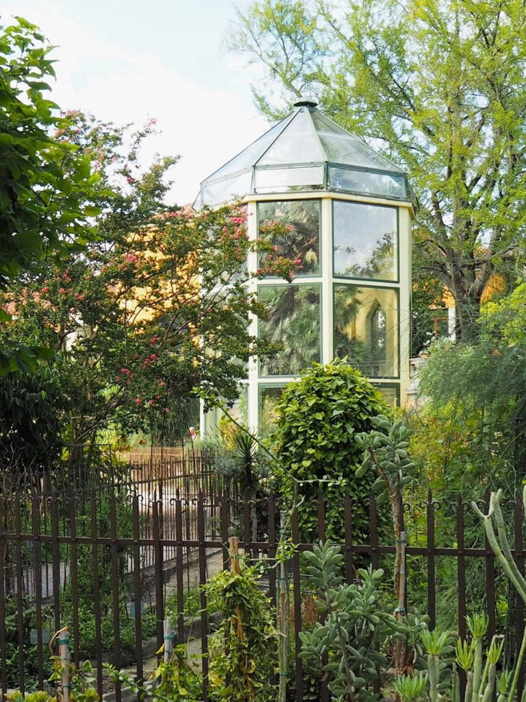 Puulle on rakennettu oma kahdeksankulmainen kasvihuone vuonna 1935. Se muistuttaa aiempaa puista kasvihuonetta vuodelta 1874. Meillä ei ollut opastusta puutarhassa, joten emme kiinnittäneet tähän puuhun sen kummempaa huomiota. Se näkyy lähinnä taustana ottamissani kuvissa. Ehkä puutarhoissa kulkemisessa tärkeintä on kuitenkin oma tunne ja kokemus paikasta, kuin kaikki täsmätieto historiasta. Sekin kun on monesti miltei käsinkosketeltavaa.