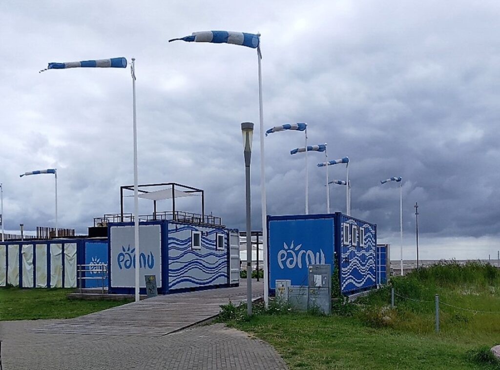Ajelin ja pysähtelin ja kävelin aika paljon Pärnussa. Pyörähdin katsomassa suuren rantasalonki Kuursaalin, jonka pihalla patsas soitti harmonikkaa, niin että kuului! Ihan kiva idea laittaa kaiuttimet patsaan lähelle. Täällä oli rantabulevardille rakennettu suuret puiset pergolatyyppiset rakennelmat, joiden alla oli isoja penkkiryhmiä. Ihmettelin vähän, miksi niihin ei oltu istutettu köynnöksiä, mutta ei ollut ketään selittämässä tilannetta. Kävin myös tepastelemassa rantaan, jossa sielläkin oli merkkejä järjestettävistä tapahtumista. Arkena ja näin huonolla ilmalla kaikki oli aika vaitonaista ja autiota.