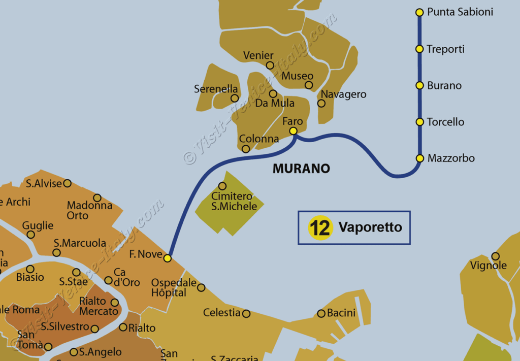 Matka Buranoon kestää noin puoli tuntia. Venebussi lähtee Fundamente Nove-pysäkiltä. Päätimme mennä ensin tälle kolmesta suunnittelemastamme käyntikohdesaaresta kauimmaiselle ja katsoa sitten riittääkö aika muihin paikkoihin. Vaporetto kulkee St Michelen hautausmaasaaren ja Muranon ohi. Näille saarille olisimme siis myös halunneet poiketa, mutta sen teki mahdottomaksi viimein sekin, että Buranosta lähdimme vaihteeksi väärään suuntaan ja tipautimme itsemme pois kyydistä Treportissa.