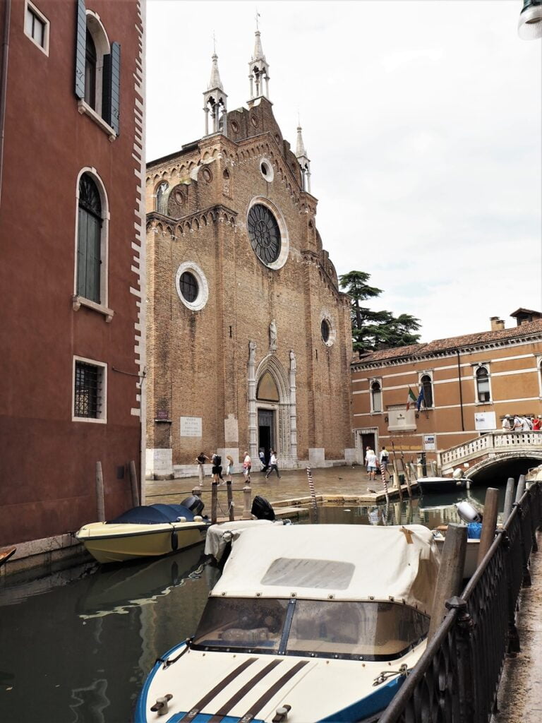 Me siis tulimme Venetsian saarelle bussilla ensimmäisen hotelliyön jälkeen. Ensimmäisenä päivänä haahuilun lisäksi tutustuimme Santa Maria Gloriosa dei Frari -kirkkoon ja sen vieressä olevaan Leonardo da Vinci -museoon. Seuraavana päivänä olimme tulossa sinne matkalaukkujen kanssa yöpymään, ja aamuisen rankkasateen vuoksi aiemmin hankitut bussiliput jäivät käyttämättä kun päätimme ottaa taksin saarelle ja syödä aamupalankin vasta siellä. Muutoin olisimme joutuneet laukkujen kanssa sateessa etsimään aamiaispaikan ja bussipysäkin. Taksi maksoi 30 euroa.